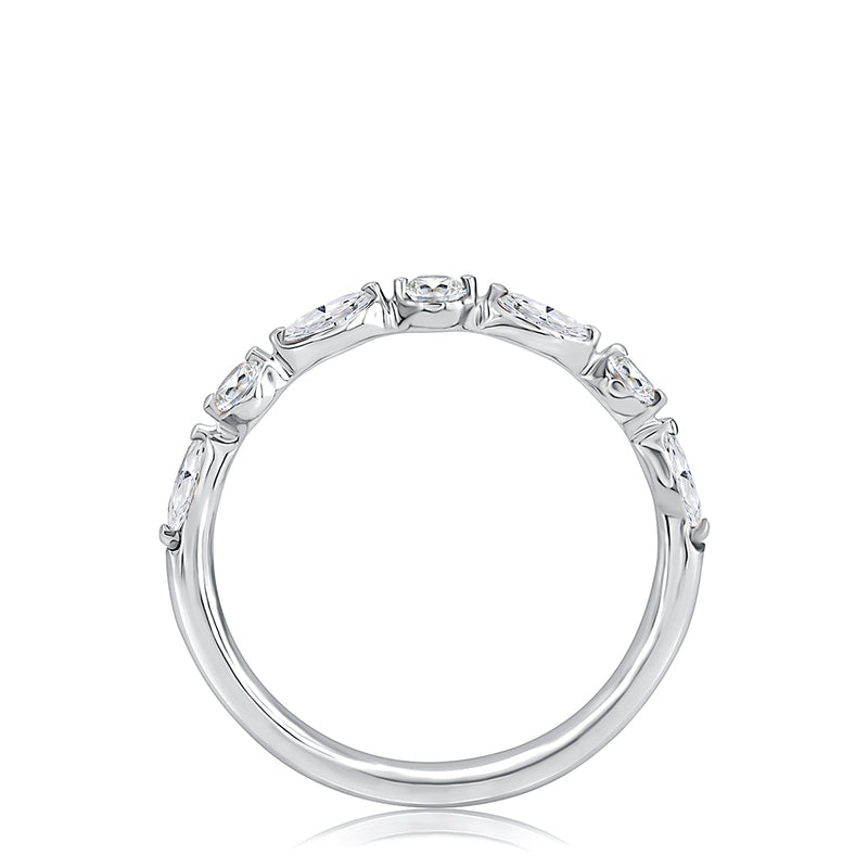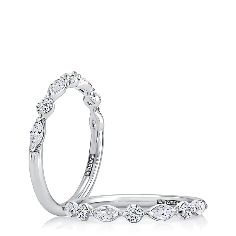 From the A.JAFFE Classics Collection comes this beatuiful delicate band that highlights alrernating round and marquise diamonds that run halfway around the band. Made for the modern band who prefer a delicate look.